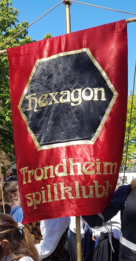 Så omtrent 1230 går vi for å stille oss opp for å gå i borgertoget. Vi har en fin dyprød, svart og gyllen fane.Toget starter å gå klokka 1305, vi må nok vente en stund før vi kommer i gang, men da har vi forhåentligvis samlet opp mange hexer.