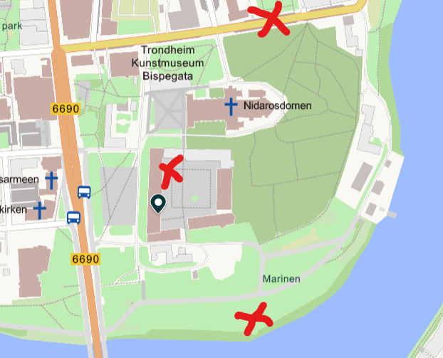 Vi starter omtrent klokka 11 i marinen (nederste kryss på kartet, eller i borgården (midterste kryss) hvis været er dårlig. Der har nok noen (kanskje du?) med noe mat, vi prater og koser oss.